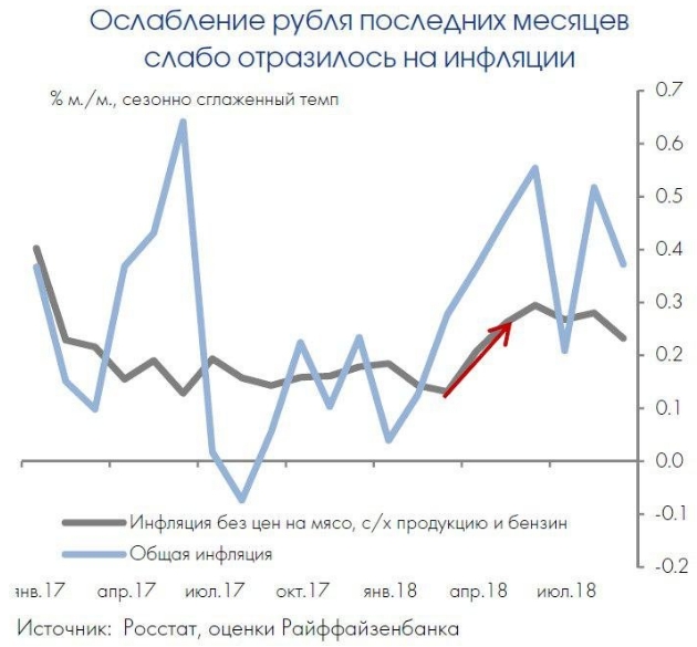 Аналитики банка отмечают некоторое ускорение инфляции в последние недели, которое обусловлено сезонными факторами - главным образом ростом цен на фрукты и овощи. При этом детали отчета Росстата говорят о том, что снижение курса рубля мало повлияло на рост потребительских цен: без учета динамики цен на бензин, мясо и с/х продукцию с апреля инфляция выросла лишь 0.1%. В этом нет ничего удивительного, так как снижение курса рубля происходило относительно плавно, т. е. российская валюта дешевела меньше чем на 10% в месяц, которые являются пороговым значением для ощутимого влияния на инфляцию.