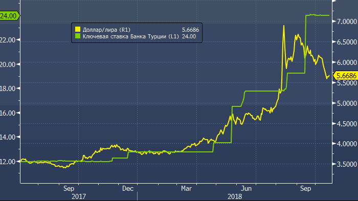 «В сентябре регулятор с запасом повысил ключевую ставку сразу на 6.25%, и с тех пор лира дорожала на фоне разрешения конфликта вокруг пастора Бронсона и намеков США на отмену некоторых санкций в отношении Турции», - пишут аналитики банка. - «Поэтому мы полагаем, что благодаря улучшению отношений между двумя странами Банк Турции на ближайшем заседании в четверг (ProFinance.ru: протокол будет опубликован в следующую среду) сохранит ключевую ставку на уровне 24%.
