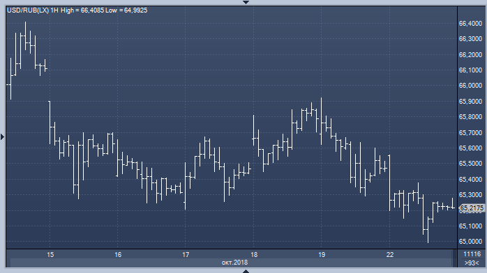 По итогам торгов в понедельник 22 октября курс доллара к рублю снизился на 27 копеек до 65.22, а курс евро к рублю - на 61 копейку до 74.81 (прим. ProFinance.ru: по состоянию на 23:50 МСК).