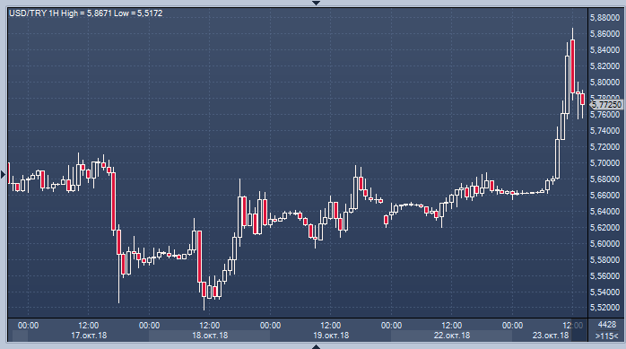 Активность покупателей слабела в течение последних дней, однако сегодня интерес к фиксации прибыли по лонгам в лире резко вырос. Катализатором этого стали новости о том, что президент Турции Реджеп Тайип Эрдоган выступит по вопросу убийства журналиста Хашогги. В преддверии этого события курс USDTRY подскочил от уровней около 5.67 к 5.86.