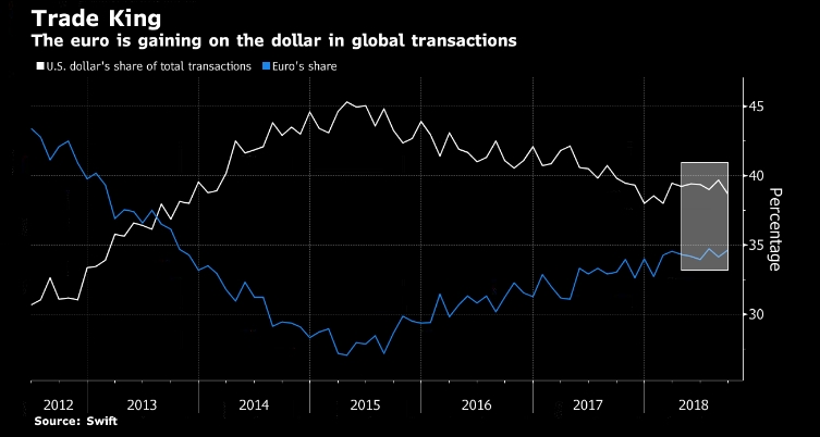 Остерегайтесь доллара, приближается время евро. Согласно данным Swift, опубликованным во вторник, единая европейская валюта, которая потеряла первое место в качестве наиболее используемой валюты для глобальных транзакций пять лет назад на фоне европейского долгового кризиса, набирает обороты в расчетах. Политика торгового протекционизма Дональда Трампа, вылившаяся в повышение пошлин Вашингтоном на китайские и прочие товары, обернулась падение доли доллара в международной торговле, и это может принести свои плоды, поскольку только 4 процентных пункта теперь разделяют долю расчетов в долларах США от доли расчетов в евро.