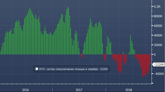 Спекулянты продолжают сокращать экстремально высокие ставки на снижение серебра. Согласно последним данным американской Комиссии по торговле товарными фьючерсами (CFTC), за неделю до 23 октября крупные спекулянты сократили объем чистой короткой позиции во фьючерсах и опционах на серебро на 11 945 контрактов до 21 209 контрактов (наименее медвежье значение за последние 10 недель).