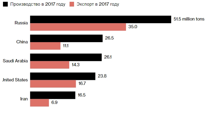 Такая авторитетная организация как «Совместная инициатива по нефтяной статистике» (JODI) подсчитала (цифры по итогам 2017 года): Россия занимает доминирующее положение на рынке мазута, производя 51.5 млн тонн, а экспортируя 35 млн тонн.