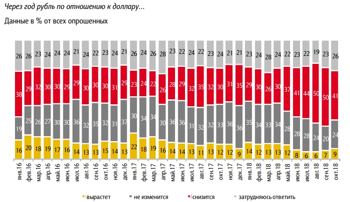 Представители «инФОМ», проводя опрос для Банка России, спросили у респондентов, как, по их мнению, изменится курс рубля к иностранным валютам ровно через год. Менее половины опрошенных (41%) считает, что российская валюта к октябрю 2019 года обесценится по сравнению с текущими значениями (в сентябре такой ответ дали 50%), 24% предполагают, что курс не изменится и 9% ожидают укрепление рубля. 26% респондентов затруднились с ответом.