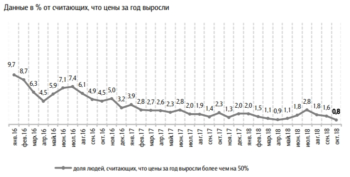 Банк России налаживает более тесное общение с населением, стараясь повысить осведомленность реальной ситуацией. Это приносит плоды. Доля людей, которые считают, что цены в стране за год выросли более чем на 50% достигла рекордного минимума. Если в январе 2016 года таких было 9.7%, то с тех пор показатель стабильно снижался и в октябре 2018 года достиг 0.8%.