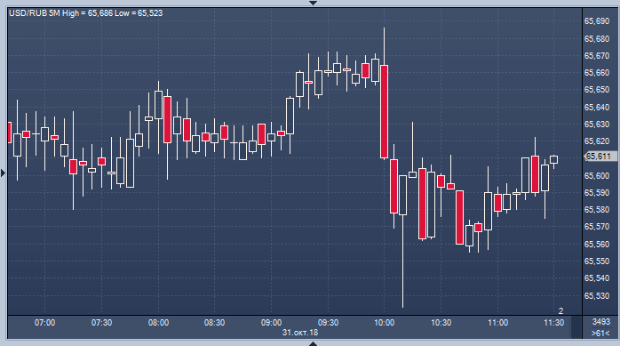 Пара доллар/рубль расчетами “завтра” к 11:11 мск находится вблизи 65.61, и рубль теряет пять копеек от уровней предыдущего закрытия. Евро расчетами “завтра” сейчас у отметки 74.43, теряя 3 копейки от предыдущего биржевого закрытия. Внимание игроков финрынков приковано к пятничным данным Минтруда США о состоянии американского рынка труда в октябре, а сегодня и завтра выйдут показатели деловой активности в промсекторе США (Chicago PMI, ISM Manufacturing PMI, Manufacturing PMI).