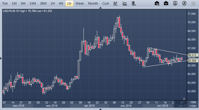 Но рубль пока нашел в себе силы игнорировать снижение нефти до 10-недельных минимумов. Отчасти это связано с долларом, его ослаблением на форексе, отчасти - с длинными предстоящими выходными в РФ, отчасти с предстоящей встречей Трампа и Путина в Париже по случаю празднования годовщины окончания Первой мировой войны и надеждой некоторых игроков на некое потепление отношений. Также не стоит забывать, что до конца года Центробанк пообещал не выходить на рынок с покупкой валюты.