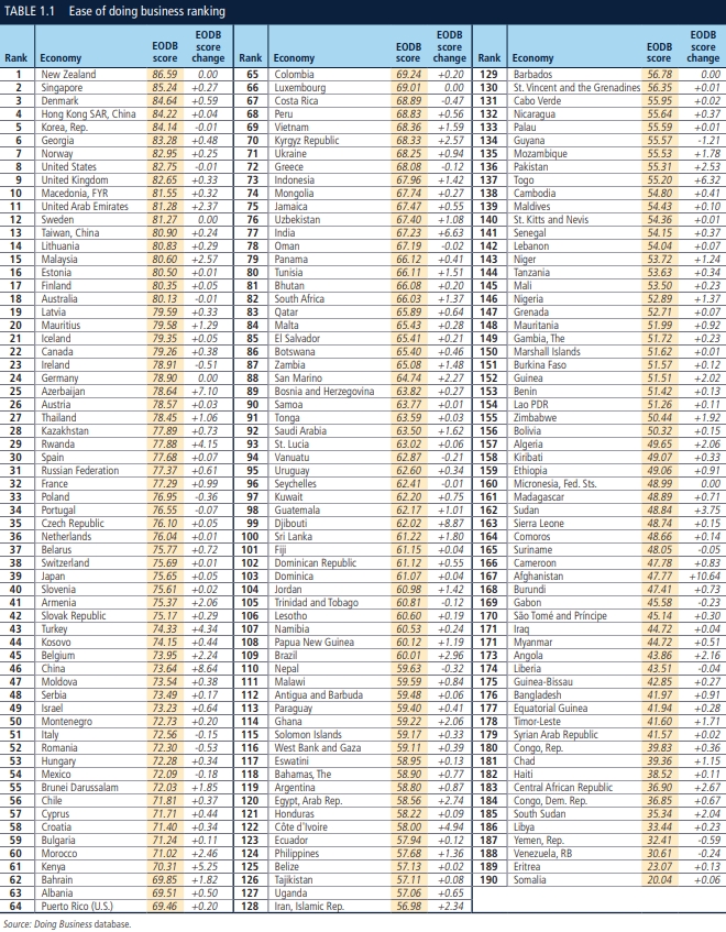 Рейтинг составляется на основе 11 показателей. Среди них: соблюдение условий контракта, уровень доступности кредитов, простота регистрации бизнеса, имущества, банкротство, уплата налогов, разрешения на строительство, международная торговля, налогообложение, электросети, качество судопроизводства.