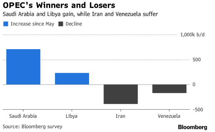 Россия, США, Саудовская Аравия не ограничивают себя в желании нарастить производство, все списывая на санкции в отношении Ирана. Даже Ливия добывает на максимумах с 2013 года.