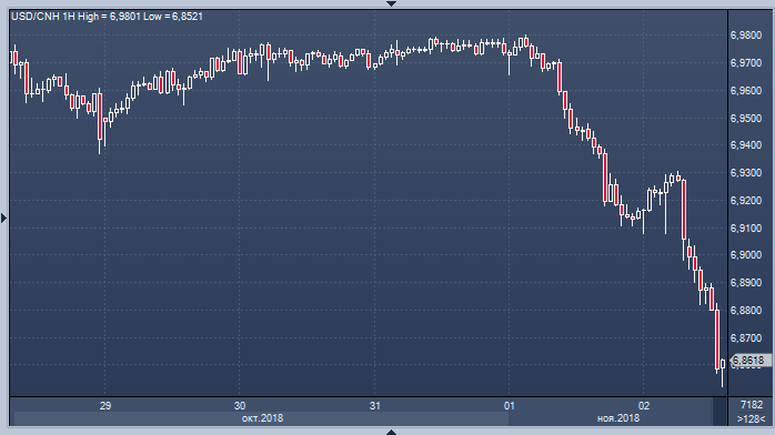 К 13:56 мск он поднялся до 6.85, хотя вчера торговался на 6.97. Трамп сказал накануне, что переговоры с Китаем “идут хорошо”, возродив надежды на то, что две страны смогут завершить торговый конфликт. Между президентом США Дональдом Трампом и председателем КНР Си Цзиньпином состоялась телефонная беседа, которая, как рассчитывают инвесторы, может стать прологом к ослаблению напряженности между Вашингтоном и Пекином в сфере торговли. Трамп сообщил, что намерен встретиться с председателем КНР Си Цзиньпином на саммите G20 в Аргентине в конце ноября. Трамп хочет подписать соглашение о торговле с Китаем в Аргентине, сообщает агентство Bloomberg со ссылкой на информированные источники. Трамп даже поручил министрам составить предварительные условия такого соглашения. В подготовке проекта документа участвуют сразу несколько ведомств.