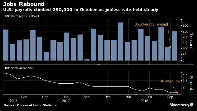 Занятость (Nonfarm payrolls) выросла на 250 000 после пересмотренного вниз прироста в сентябре на 118 000, показал отчет Департамента труда в пятницу. Согласно средней оценке в опросе Bloomberg ожидался рост на 200 000 рабочих мест. Средняя почасовая заработная плата для частных работников выросла на 3.1 процента по сравнению с предыдущим годом, а безработица осталась неизменной с сентября на уровне 3.7 процента, что соответствует прогнозам.