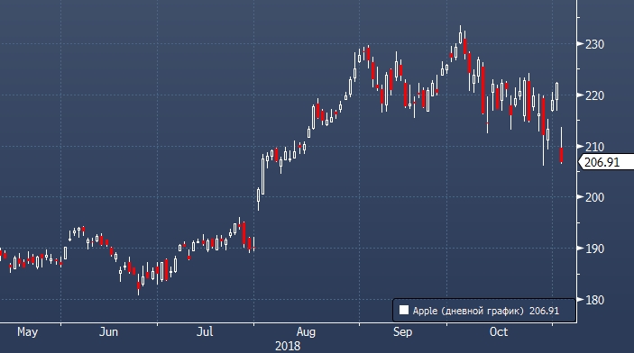 Бумаги технологических компаний утянула за собой вниз Apple — акции компании потеряли более 7%. Компания, которой уже несколько лет не удается удивить аудиторию своими продуктами, сумела преподнести большой сюрприз инвесторам. Выручка Apple превзошла ожидания, однако прогноз на следующий квартал оказался хуже консенсуса. Однако еще более тревожным событием стало заявление компании о том, что со следующего квартала она перестанет публиковать данные о продажах iPhone, iPad и компьютеров Mac по подразделениям