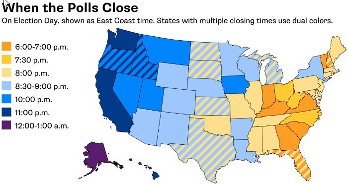 Все зависит от того, насколько быстро удастся подсчитать голоса и насколько большим будет разрыв. Борьба за многие места в палате представителей идет в восточных штатах, таких как Флорида, Северная Каролина, Пенсильвания и Вирджиния, это значит, что к 8 часам вечера по восточному времени (4 утра 7 ноября по Москве) голосование уже закончится. В 23.00 EST (7 утра по московскому времени) закроются избирательные участки в одном из самых населенных штатов, в Калифорнии и, возможно, уже к этому времени станет ясно, кто будет контролировать палату представителей.