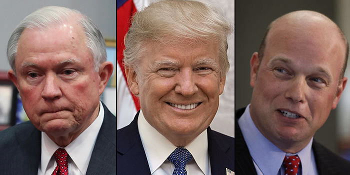 | На фото: слева направо - Джефф Сешнс, Дональд Трамп и Мэтт Уитэйкер |