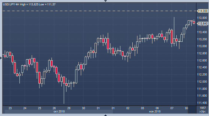 Тем не менее, эксперт признает, что трудно оставаться быком по доллару в долгосрочной перспективе, учитывая неопределенность в отношении того, сможет ли Трамп еще больше увеличить бюджетные расходы после того, как промежуточные выборы привели к расколу конгресса. Есть опасения по поводу того, что замедление экономики ограничит доходность в США, в результате чего доллар может начать ослабевать. Рыночная тенденция остается такой же, как и до промежуточных выборов в США, особенно для валют G-3, поскольку инвесторы продолжают торговать ими на основе конкретных факторов, таких как Brexit для фунта и FOMC для доллара. На данный момент ожидается, что доллар/иена (USD/JPY) будет постепенно тестировать верхние уровни, подбираясь к Y114, но подняться выше этого уровня будет сложнее. Дилеры, опрошенные Bloomberg, ранее сегодня сообщали, что данный уровень отмечен опционами, которые спекулянты будут защищать.