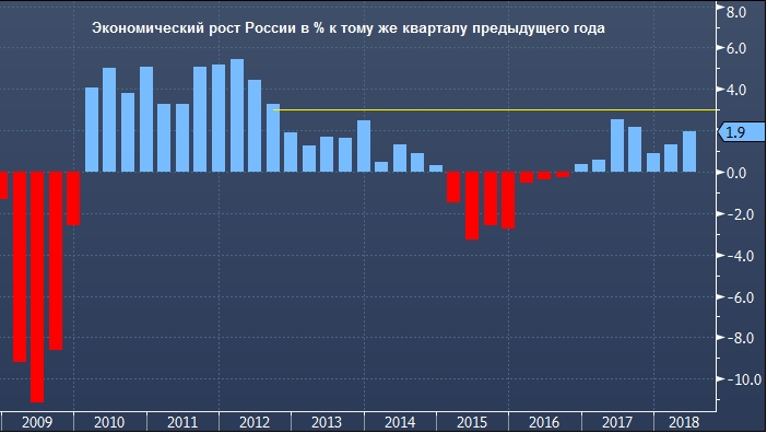 Предварительные данные по ВВП РФ за 3 квартал 2018 года будут опубликованы на следующей неделе. Ожидается, что экономический рост составит 1.4% г/г. По итогам 2 квартала текущего года ВВП в годовом исчислении вырос на 1.9%.