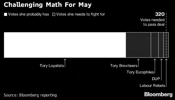 «Учитывая ранее прозвучавшие за пределами кабинета министров комментарии, маловероятно, что правительство способно получить магического числа 320», - сказал Джонс, глава отдела продаж хедж-фондов в Лондоне в Мизухо, имея в виду количество голосов, необходимых для одобрения сделки Brexit в парламенте. «Это ключевой момент: за что проголосует парламент. Без 320 голосов парламентариев фунт нужно продавать».