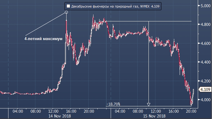 Контракты с поставкой в декабре днем ранее достигли 4-летнего максимума ($4.93) и отскочили от него 15 ноября в четверг до $3.93 за миллион британских тепловых единиц (MMBtu). Затем котировки вернулись к $4.11 за MMBtu. Торговый объем более чем в 2 раза превысил средний показатель за последние 100 дней.