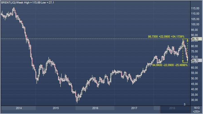 Цены на нефть 3 октября 2018 года достигли четырехлетнего максимума, и в тот момент на рынок вернулись разговоры о том, что скоро цена вновь поднимется до $100 за баррель. С тех пор Brent стремительно подешевел на 25.5% на фоне роста уровня запасов в США и информации о том, что 8 стран получили поблажки в экспорте иранской нефти.