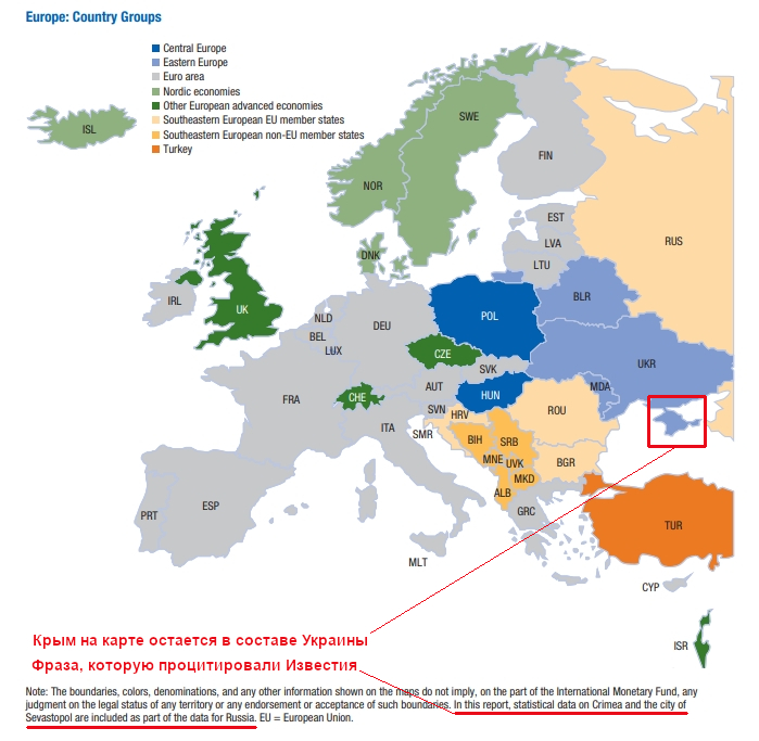 «In this report, statistical data on Crimea and the city of Sevastopol are included as part of the data for Russia», — цитируют «Известия» отчет МВФ.