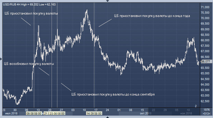 По мере приближения даты окончания моратория на покупку валюты ЦБ на рынке для Минфина в рамках бюджетного правила — конца декабря 2018 года — растет актуальность этого вопроса для участников рынка. Банк России определится и сообщит рынку о своих намерениях по этому вопросу лишь к концу года. При принятии решения о возобновлении таких покупок будет учитывать не курс рубля, а волатильность рынка, вновь повторила председатель ЦБ Эльвира Набиуллина, отвечая на вопрос агентства Bloomberg.