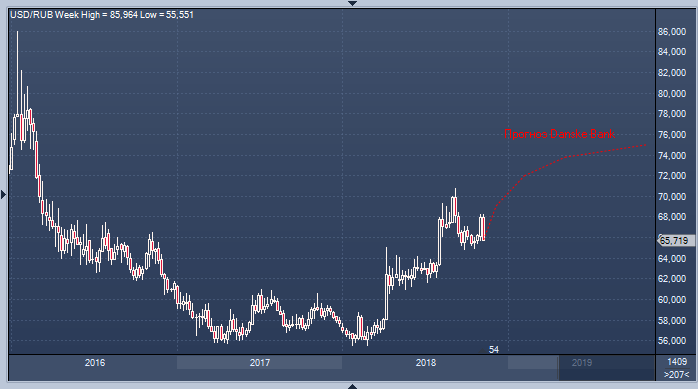 В отсутствие новых рестрикций в уходящем году и первом квартале 2019 рубль может продемонстрировать заметное восстановление, но в Danske Bank смотрят в будущее с недоверием. Российская валюта остается серьезно недооцененной с точки зрения уровня цен на нефть и фундаментальных факторов, однако аналитики не думают, что это помешает ее ослаблению в следующем году — в прошлом медведей это не останавливало. В банке предрекают рост курса доллара к рублю к 72 в трехмесячной перспективе, тогда как прогнозы на 6 и 12 месяцев составляют 73.80 и 75.10 соответственно.