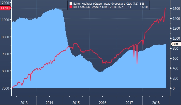 Число буровых в Пермиан увеличилось на 1 единицу до 493 штук, в Игл Форде — на 2 до 70, в Кана Вудворд — на 1 до 58. В Ниобраре и Уиллистоне их число осталось прежним — 29 и 57 соответственно. Число горизонтальных установок выросло на 4 единицы до 939, число направленных сократилось на 3 до 71, количество вертикальных осталось на уровне 72 штук.