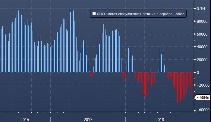 Спекулянты резко увеличили ставки на снижение серебра. Согласно последним данным американской Комиссии по торговле товарными фьючерсами (CFTC), за неделю до 13 ноября крупные спекулянты увеличили объем чистой короткой позиции во фьючерсах и опционах на серебро на 18 512 контрактов до 38 846 контрактов (наиболее медвежье значение за последние 5 недель).