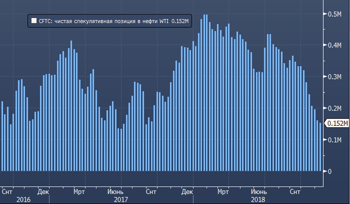 Спекулянты продают нефть WTI десятую неделю подряд. За неделю до 13 октября они сократили объем чистой длинной позиции во фьючерсах и опционах на нефть WTI на 8 307 контрактов до 151 984 контрактов (14-месячный минимум), следует из последних данных американской Комиссии по торговле товарными фьючерсами (CFTC).
