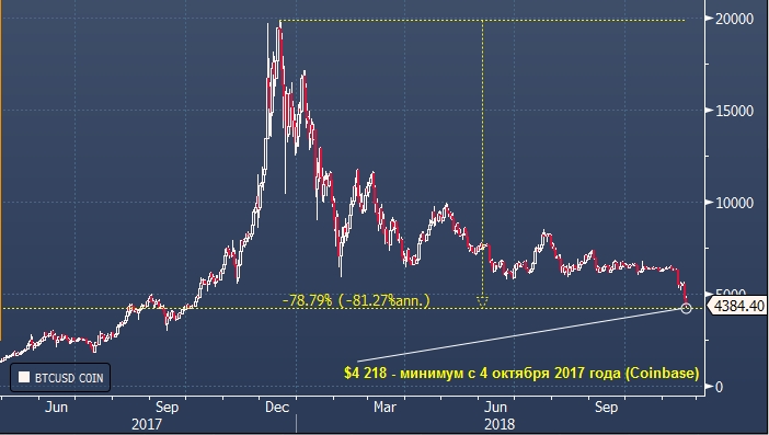 Курс биткоина на популярной американской криптобирже Coinbase во вторник 20 ноября упал до минимумов с 4 октября 2017 года на уровне $4 218. С максимумов 17 декабря самая популярная криптовалюта обесценилась на 79%.