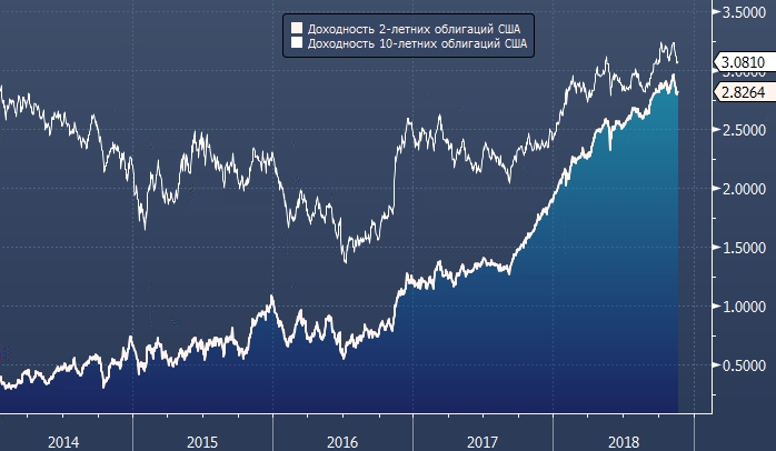 На графике изображена доходность 2- и 10-летних облигаций США. Когда доходность последних окажется ниже доходности коротких бумаг, произойдет так называемая инверсия кривых, являющаяся надежным сигналом надвигающейся рецессии в экономике.