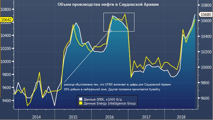 Напомним, в ноябре 2016 года Саудовская Аравия установила свой рекорд добычи нефти в размере 10.72 млн б/д. Затем в течение двух последующих месяцев страна резко сократила производство до 9.8 млн б/д. Текущий ноябрь имеет все шансы на то, чтобы побить абсолютный рекорд двухлетней давности.