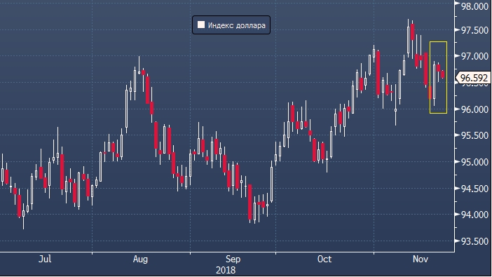 На международном валютном рынке доллар в среду и в четверг дешевеет против своих основных конкурентов после взлета во вторник. Участники рынка фьючерсов на ставку по федеральным фондам снижают вероятность ужесточения денежно-кредитной политики США в следующем году. Они закладывают риски снижения глобального экономического роста, угасание эффекта фискальных стимулов в США и предполагают, что Федеральная резервная система (ФРС) станет более осторожной в вопросе повышения ставок.