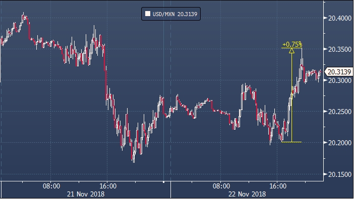 Курс мексиканской валюты упал в четверг на 0.75% до 20.35 песо за доллар, но затем немного восстановился до 20.31. Сегодня в США празднуют День благодарения. Финансовые рынки не работают. Возможно, по этой причине реакция сдержанная. Интересно понаблюдать за развитием рыночной ситуации после завершения праздников.
