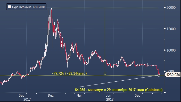 Накануне курс биткоина упал до минимального значения за 13 месяцев чуть выше $4 000 за монету. С максимумов декабря прошлого года самая популярная криптовалюта в мире обесценилась на 80%. При этом только за прошедшую неделю BTC утратил порядка 30% своей стоимости. Капитализация всего цифрового сегмента снизилась до $139.3 млрд. По сравнению с максимумами 7 января 2018 года на уровне $827 млрд показатель сократился почти в 6 раз.