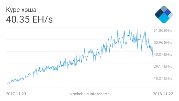 Техническая статистика подтверждает спад. Так, данные ресурса blockchain.com показывают, что 27 августа хешрейт в сети биткоина достиг максимума на уровне 61.87 терахешей в секунду (TH/s). 21 ноября показатель упал на 44% до 34.73 TH/s. Михаил Шульгин