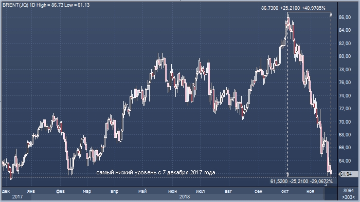 Стоимость Brent в пятницу 23 ноября обновила минимум 2018 года и достигла самого низкого значения с 7 декабря 2017 г. на уровне $61.52 за баррель.
