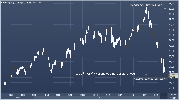 Стоимость Brent в пятницу 23 ноября обновила минимум за 12 месяцев и достигла самого низкого значения со 2 ноября 2017 г. на уровне $60.28 за баррель.
