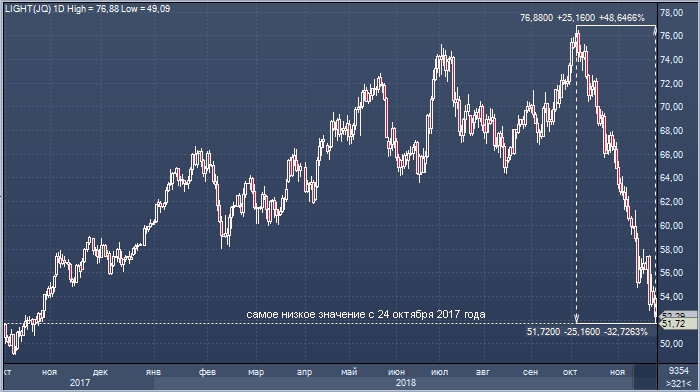 Нефть WTI упала в пятницу до $51.72 за баррель — наиболее низкая цена с 24 октября 2017 года (минимум за 13 месяцев). С 4-летних максимумов, достигнутых в начала октября на уровне $76.88 за баррель западно-техасская легкая нефть обесценилась на 33%.