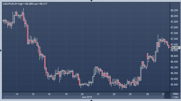 Рубль прервал свое падение, однако не спешит восстанавливать позиции, и риск новой волны продаж сохраняется. Инцидент в Черном море, с одной стороны, дал западным СМИ повод реанимировать миф о российской агрессии в момент, когда рынок только свыкся с мыслью о том, что до конца года новых серьезных санкций ждать не стоит, а на горизонте в свете реализации «Северного потока-2» и «Турецкого потока» замаячило прекращение транзита газа через Украину. С другой стороны, президент Украины Петр Порошенко смог воспользоваться провокацией для введения с 28 ноября военного положения на Украине. Это решение призвано укрепить его политические позиции в преддверии президентских выборов, которые пройдут через четыре месяца. Их близость и низкий рейтинг Порошенко дают повод опасаться новых попыток заработать очки на российской теме. Не способствует позитивному настрою в отношении рубля и динамика нефти, при этом в ближайшее время он лишится еще и поддержки со стороны налоговых платежей.