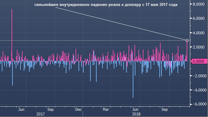 Курс бразильского реала по итогам торгов в понедельник реализовал максимальное внутридневное снижение в процентах за последние 18 месяцев.