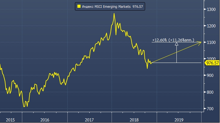 Эксперты JPMorgan Chase & Co. также прогнозируют рост индекса MSCI к концу 2019 года на 13% (к текущим значениям) до 1 100 пунктов. В 2018 году MSCI EM упал почти на 16%. С момента глобального кризиса 2008 года это третий наихудший показатель.