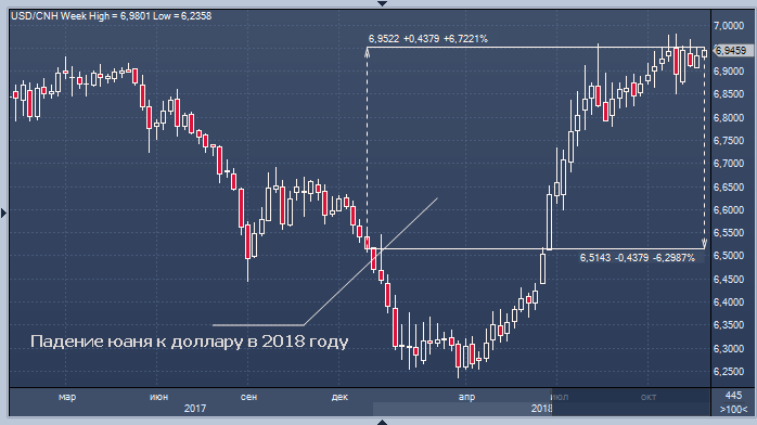 Юань упал примерно на 6 процентов против доллара в этом году в ответ на эскалацию торгового конфликта между двумя странами. На внутреннем рынке юань приблизился к ключевой отметке в 7 за доллар.