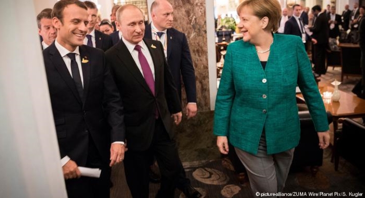 На фото: Эммануэль Макрон, Владимир Путин, Ангела Меркель