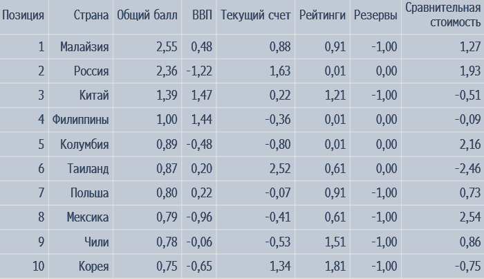 Лидерство досталось Малайзии благодаря размеру профицита текущего счета, относительно стабильному экономическому росту и оценочным показателям сравнительной стоимости. Россия заняла второе место. Тройку лидеров замыкает Китай. Филиппины и Колумбия находятся на четвертой и пятой строчке соответственно. Сразу три азиатские страны попали в топовую пятерку. Государства азиатского региона лучше защищены от негативного влияния повышения процентных ставок ФРС США, объясняют эксперты Bloomberg.