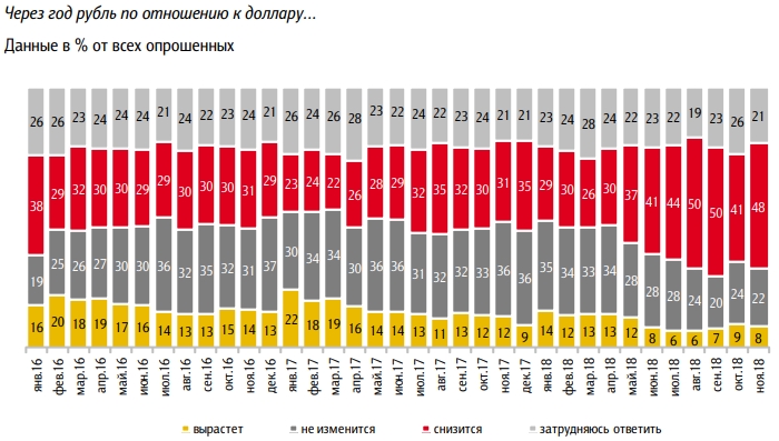 Представители «инФОМ» традиционно спросили у респондентов, как, по их мнению, изменится курс рубля к иностранным валютам ровно через год. 48% считает, что российская валюта к ноябрю 2019 года обесценится по сравнению с текущими значениями, 22% предполагают, что курс не изменится и 8% ожидают укрепление рубля. 21% респондентов затруднились с ответом.