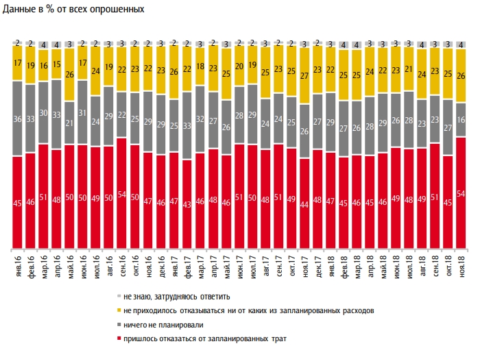 В ноябре 54% респондентов заявили, что им пришлось отказаться от запланированных трат. Последний раз показатель был на таком уровне в сентябре 2016 года. Прирост по сравнению с октябрем составил 9% — опять же максимальное значение за весь период наблюдений с января 2016 года.