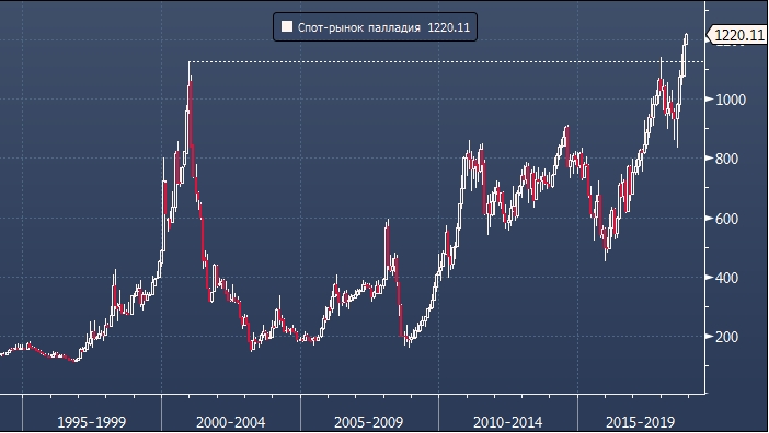 На торгах в понедельник 3 декабря спот-цены на палладий обновили свой исторический максимум и достигли $1 223 за унцию. С начала года драгоценный металл подорожал на 14.5%. До середины августа палладий терял в цене и снизился до годового минимума на уровне $834 за унцию. С тех пор он взлетел в цене почти на 47%, обновив исторический пик.