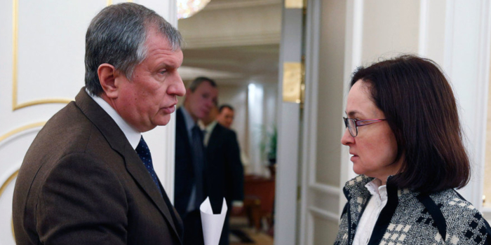 На фото (слева направо): главный исполнительный директор компании Роснефть Игорь Сечин и председатель Центрального банка РФ Эльвира Набиуллина