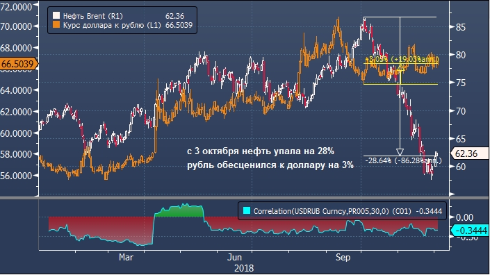 Если с 3 октября нефть Brent на мировом рынке упала на 28.6%, то рубль снизился к доллару всего на 3%. В предыдущие годы коэффициент корреляции (прим. ProFinance.ru: 30-дневная скользящая средняя) между динамикой Brent и курсом USDRUB традиционно составлял от -0.8 до -1.0. То есть с вероятностью 80% рубль дорожал, если нефть росла в цене. Но в апреле и мае взаимосвязь из-за санкций стала положительной: нефть росла, но рубль дешевел. С тех пор коэффициент не превышал -0.5, а в настоящий момент составляет -0.34.